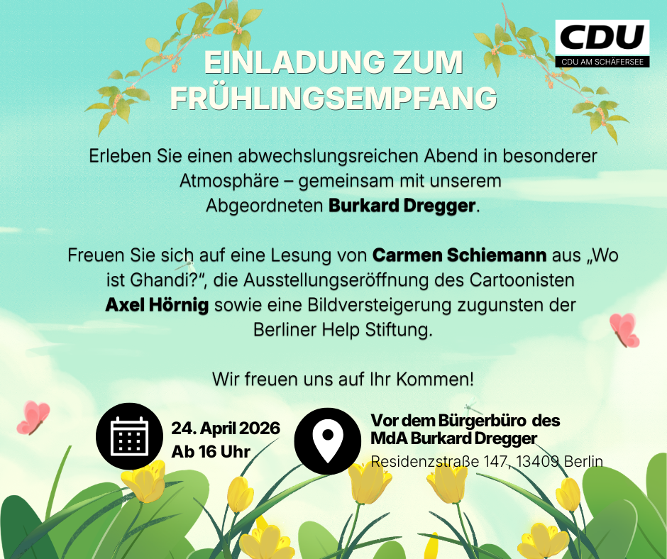 Nutzen Sie die Gelegenheit, in entspannter Atmosphäre ins Gespräch mit unserem Abgeordneten Burkard Dregger zu kommen, Fragen zu stellen und aktuelle Themen aus dem Kiez zu besprechen.